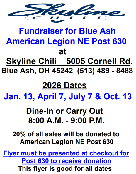 The present Dues amount is $45.00. When renewing your Membership, please make your check payable to American Legion Post 630. Mail your check to American Legion NE Post 630, PO Box 42223, Blue Ash, OH 45242 or you can go to www.mylegion.org and pay your dues online.